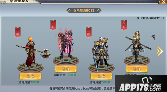 “帮派BOSS”每天可以进行召唤,BOSS一共分为十个等阶,等阶越高的BOSS战斗力就越可怕。帮主或副帮主每天可以召唤1次BOSS让大家挑战,众帮友群起而攻之,击败了穷凶极恶的BOSS后按照伤害百分比,给每一位帮派成员发放绑定元宝和大量的铜钱奖励!