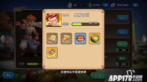 装备共有、四个(武器、衣服、鞋、配饰),增加不同属性。装备还分三阶(铜、银、金),每阶共10级,强化满后可使用指定材料进阶,每次强化都需要消耗指定的材料和铜钱。