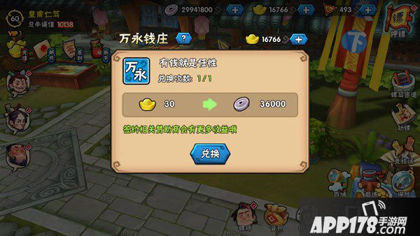 在进入游戏主界面中,屏幕上方可查看到玩家当前的货币数量。点击加号图标后,显示万永钱庄。万永钱庄表示,在钱庄中可以通过消耗元宝兑换铜钱,每天可以兑换三十次,与某些赞助商签约后能提高汇率比例。每次兑换后可能会获得更高倍数的铜钱。