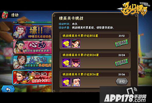 主界面活动功能中,我们还能看到精英关卡挑战的活动。按照活动要求,达到指定的星级积累,就可以获奖励。基本每完成一年的主线剧情,可以领取一次活动奖励。单次奖励100元宝+指定蓝色镖师碎片15个。虽然奖励不是太丰富,但毕竟是额外的奖品,聊胜于无。