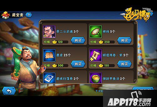 V6解锁藏宝斋功能,出售物品全部为元宝商品,商品列表每天刷新3次,主要有武魂、装备强化材料、食物、扫荡卷轴等等。元宝买材料和武魂的性价比不是太高,中R大R如果有富裕元宝倒是可以玩玩,其它元宝不够日常花销的玩家不推荐购买,当然,如果有某些急需进阶的镖师,这种情况另算。最新上架的磨练扫荡卷轴的性能还是比较不错的,50元宝两个,想省事的不妨入手。