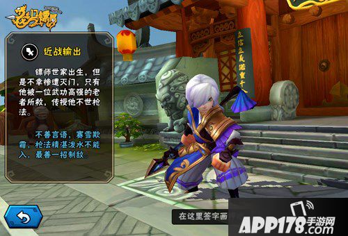 角色背景:自幼失去双亲,从小养成了刚毅的性格。立志做一名威震江湖的镖师,16岁时,在一次押镖的过程中遭遇劫镖,恰巧一位武功极高老者经过救了他。