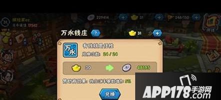 在游戏主界面中,屏幕上方可查看到玩家当前的铜钱数量。点击右侧加号图标后,显示万永钱庄。万永钱庄表示,在钱庄中可以通过消耗元宝兑换铜钱,每天兑换次数有上限,在账房先生周凯文处与万永商号签约能提高汇率比例,每次兑换后可能会获得更高倍数的铜钱。