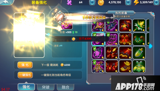 装备强化消耗一定金币对装备进行升级提升,也可一键强化到当前角色等级,还可以进行装备突破和融合相关操作。