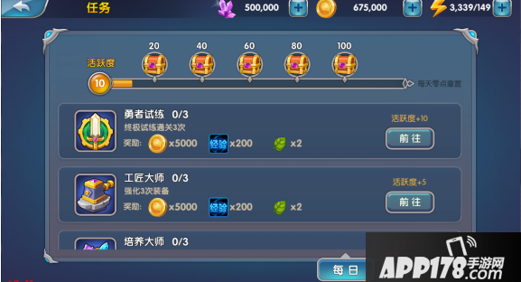 由每日任务和成就组成,完成相应的任务增加活跃度,活跃度达到相应的值时可以开启每日活跃宝箱。