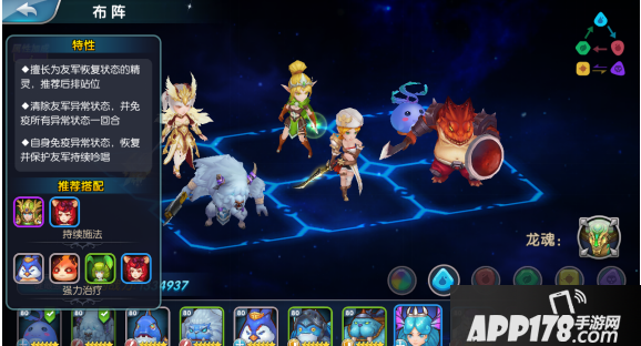 对当前阵容进行布阵操作,同时可以看到各精灵特性、推荐搭配、属性克制等。