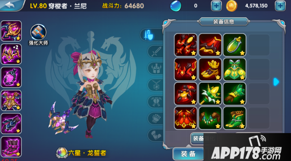 英雄界面可以进行装备查看、装备强化、批量出售,晋升,主角详情查询相关操作。