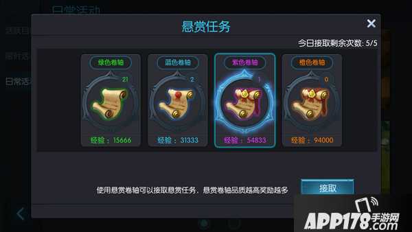 5、悬赏任务每天放在后面才做,因为游戏活动可以获取悬赏卷轴,我们每天要做的是保证在有5个卷轴可用的情况下把多余的卷轴尽可能的合成高级,等其它活动都做完再根据一天获得的悬赏卷轴数量进行合成,这样能获取更多经验。