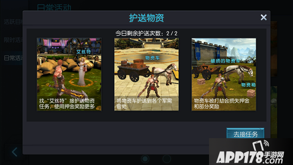 2、护送物资在阵营护送是简单有额外的经验加成,马车如果不是橙色,用钻石刷出橙色,能增加不少经验,最低也要保证是紫色马车,花点钻石不要心疼;运输前记得投保,也有经验加成。