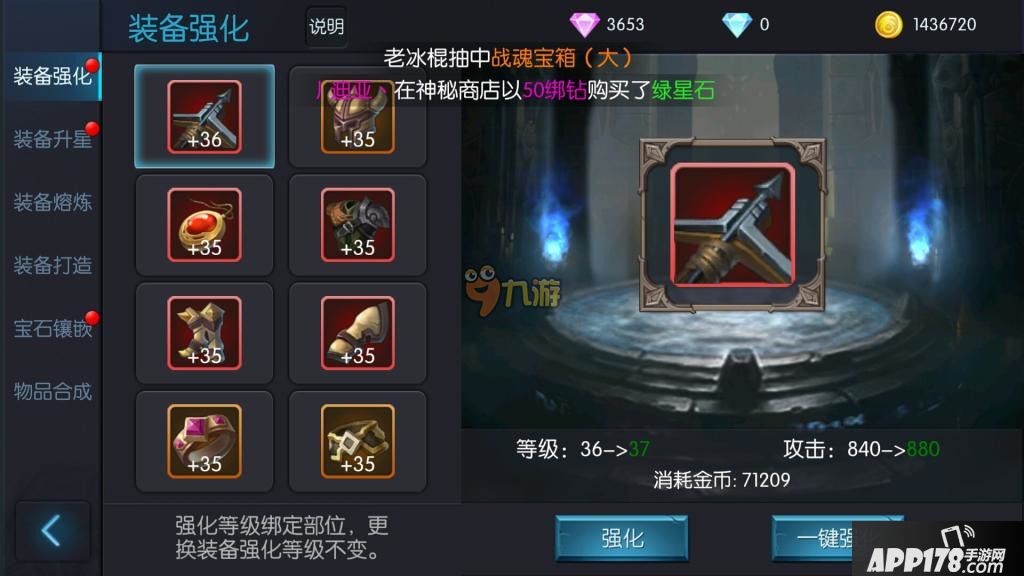 如图:35→36 47000+金币,36→37 71000+金币,每次强化金币消耗几乎是翻倍的增加,后期8件装备强化一次动则需要上百万金币。