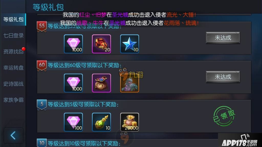 ① 等级礼包 从5级至60级可获得4900粉钻。