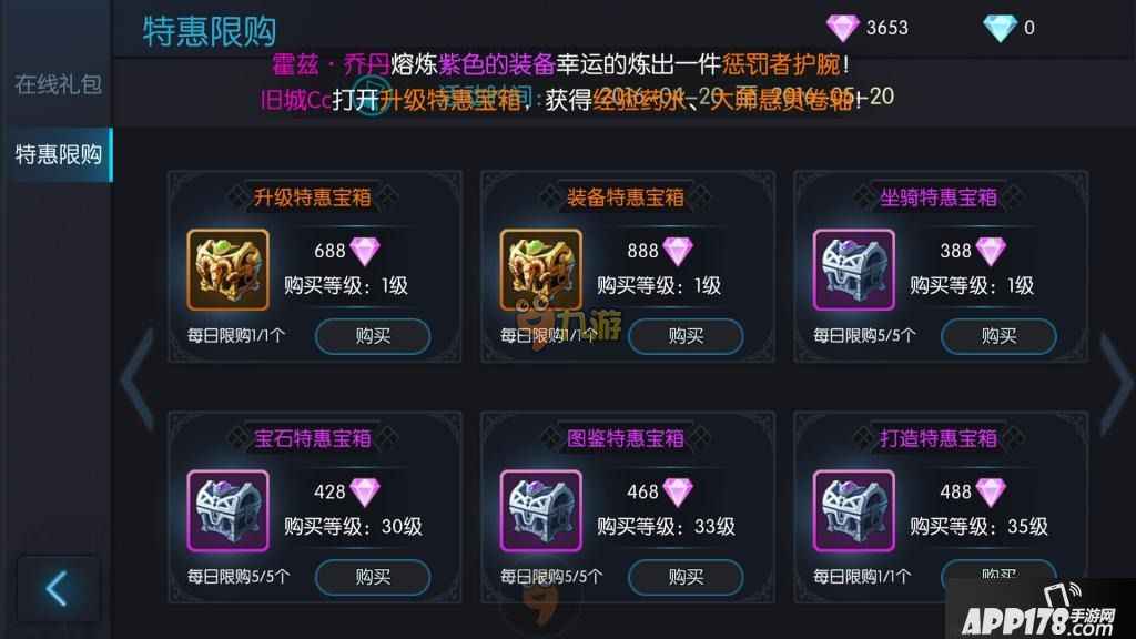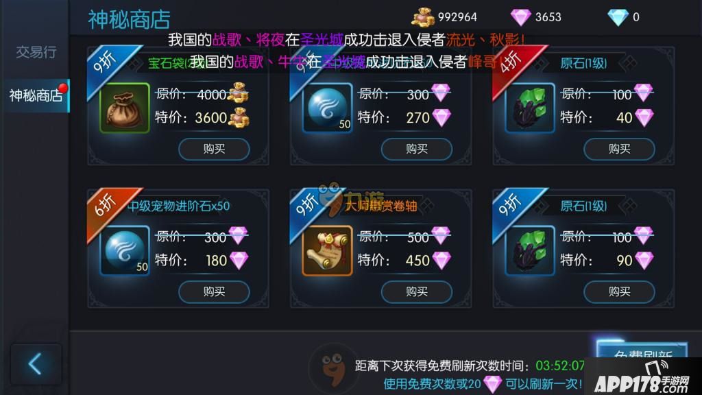打4-9折出售各种宝石、材料。看到4、5折的物品免不了剁手,当然早期最重要的是购买大师橙色卷轴,经验等级的提升才是王道。
