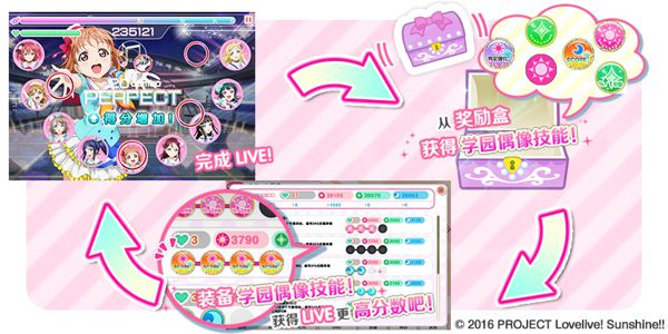 学园偶像技能是一种技能用来在游戏中增强社员。可以从奖励盒中获得这些技能,而奖励盒需要在LIVE中获得。根据学园偶像技能的类型总共有4种。强大的技能需要多个卡槽来增强社员能力。