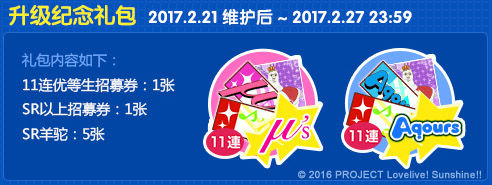 作为纪念,凡是进行更新的所有用户,2/21起的7天内,每天将发放特别登录奖励Loveca、招募券!
