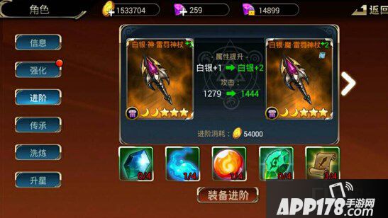 5、通过点击:人物头像->角色->装备->(任意装备)-> 进阶 的顺序找到进阶所需的材料;点击材料可以直接跳转到对应副本,通过扫荡副本获得进阶材料顺便花掉多余的体力,背包满了卖掉多余装备。