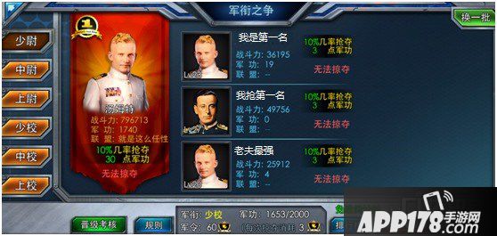 军衔从少尉到元帅分为10个等级按军衔等级分为10个不同的联赛,击败对手可以获得军功,并且抢夺对手一部分资源,军功积累到上一级军衔的要求后,可以挑战考官,战胜考官后可晋升到更高一级军衔
