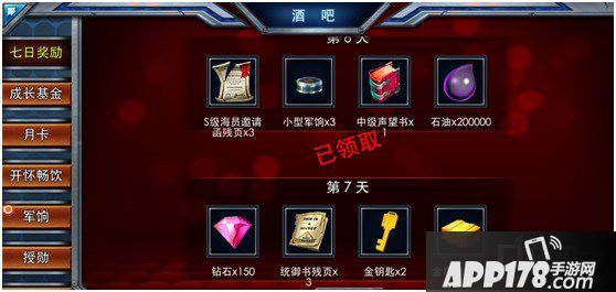 《雷霆舰队》酒吧是福利系统的集散地。包括:七日登陆领奖:玩家首次注册后,可以领取开服7日登陆。超过7日后,此奖励会变成循环式奖励,每天均可领取。开怀畅饮:每天中午和晚上可以在此免费领取精力