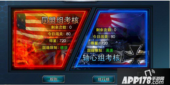 雷霆舰队中军事考核分2组,轴心组和同盟组,每天可各挑战一次