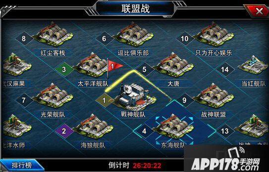 在联盟页面下方点击【联盟战】按钮即可进入联盟战页面,地图中每一个小岛均被一个联盟占领,越靠近地图中心的岛屿得分排名越靠前!