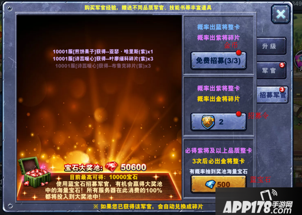 将领招募分三种方式,分别是金币、招募令和蓝宝石。