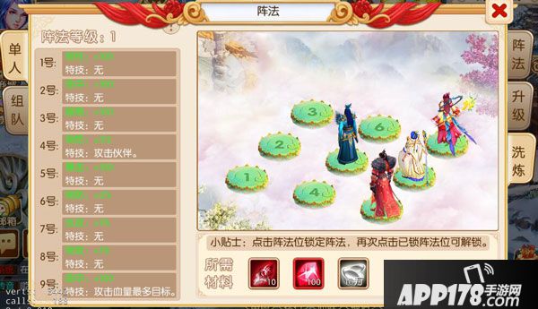 玩家可以在阵法升级界面消耗一定材料来提升阵法等级,增强阵法属性,但是特技无法改变。