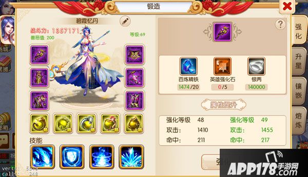 我们可以看到,强化需要百炼精铁、强化石、银两,每强化一次就可增加一定的战斗力哦~