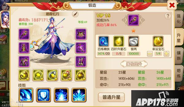 升星需用用百炼精铁、升星石、银两,成功概率可利用幸运宝石进行提高升星概率。也可以利用高级升星提高升星成功率,利用高级升星失败了是不会降星的哦。