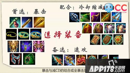 炸的技能攻击,搭配的装备自然首选暴击与减CD的结合或全暴击装,根据战况搭配一些攻速装也是不错的。