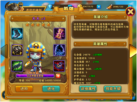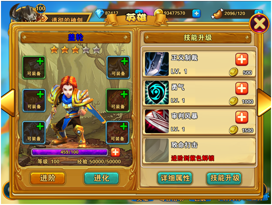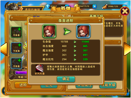 当6件英雄装备全部穿好后,就可以通过英雄进阶功能,提升其品质来提高英雄战斗力。