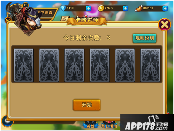 下面就为大家来详细介绍一下这个系统的玩法。卡牌大师系统在玩家15级时开放,每天可以完3次。点击开始按钮,开始游戏,卡牌大师就会给大家发牌。