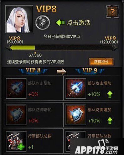 VIP的特权会随着VIP等级的提高而增多,玩家可以点击人物头像旁的【VIP】按钮,进入VIP界面后即可查看当前的VIP点数,当VIP点数达到一定数值后即可提升VIP等级。想要提升VIP点数可以使用VIP点数道具,VIP点数道具可以用金币购买,也可以通过各种奖励获得。除此以外,每天登录还会自动获得一定的VIP点数。VIP等级提升后会自动激活一天的VIP特权,不用消耗任何道具。