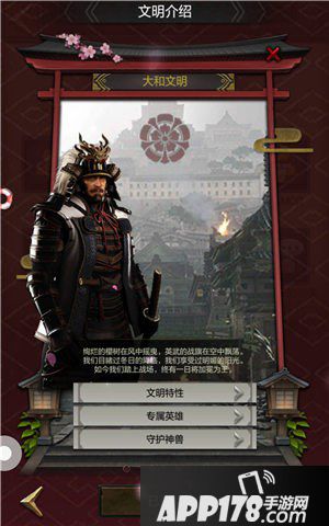 大和文明有着悠久的历史,这支来自东方的势力一直笼罩着神秘的气息。其实大和的人民敬爱天神,注重礼教,是一个信奉君权神授的帝国,并且像樱花一般,热爱浪漫与和平。他们相信礼貌善良会得到神明的认可,因此这里的人们生活在平静祥和的氛围之中。