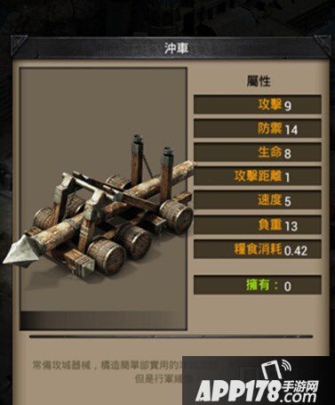冲车攻击9、防御14、生命8、攻击距离1、速度5、负重13、粮食消耗0.42。