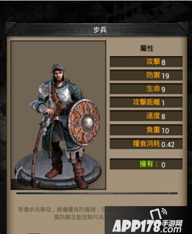 步兵攻击8、防御19、生命9、攻击距离1、速度8、负重10、粮食消耗0.42。