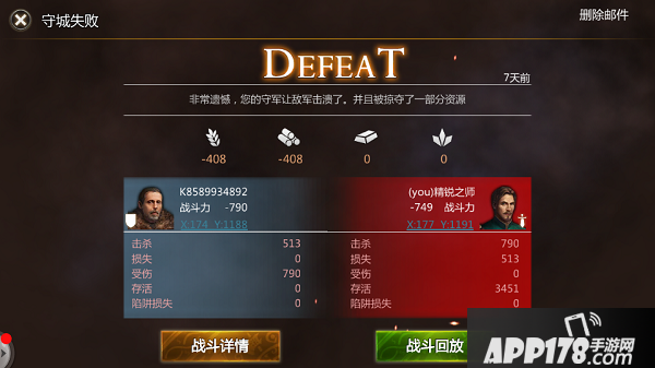 点开具体的战报信息,则可以看到战争的具体记录,包含战斗结果、被掠夺的资源或者掠夺到的资源数量,战斗双方军队击杀、损失、存活数量。