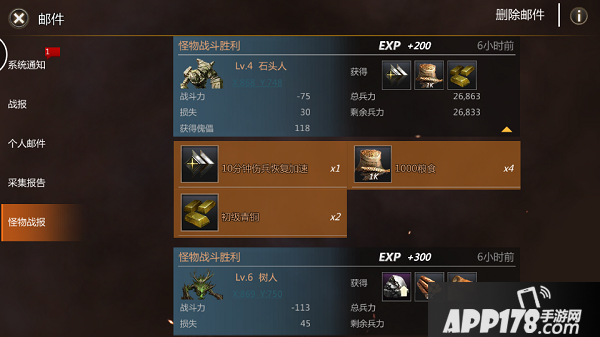 怪物战报显示玩家攻打怪物的记录,点击单次怪物战报可以查看获取的经验,战斗损失、获得的傀儡数量以及获取的资源数量。