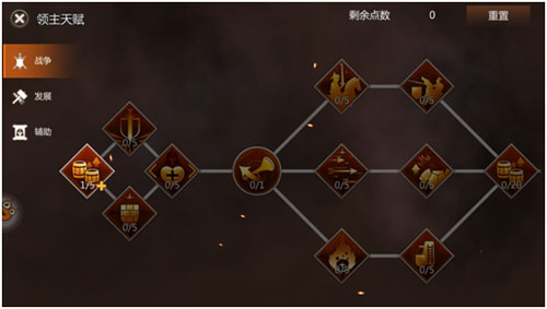 除了装备之外,玩家对领主的培养还包括领主天赋,领主天赋分为战争、发展和辅助三条路线,战争线主要强化部队的战斗能力、发展线主要提升城堡的资源产出能力、而辅助线则可以让你的行动更加迅速和灵活,在大规模的军事行动中有出其不意的表现。