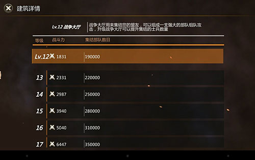 战争大厅是《列王时代》中玩家发动战争时集结强大军队的必备建筑,当玩家城堡到达7级即可开启。由于该建筑可决定你能够集结的士兵数量,所以优先升级该建筑能够更直观的提升你的战斗力。同时,在使用战斗大厅时也有个小技巧:当你计划发动大规模战斗之前,最好先提前联系好自己的盟友,以获得最大支援;而在时间方面,则要根据盟友与你的城堡间的距离来决定。此时,在全部军队集结完毕后发动总攻,必将让你在战斗中无往不利!