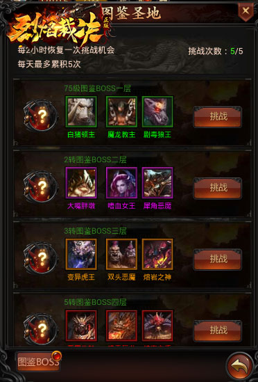 在游戏中,还有个神秘的地方名为图鉴圣地,可以产出各种图鉴卡牌。在图鉴圣地,共有5个不同的副本,玩家满足相应的等级需求才能进行挑战。副本每2小时恢复一次挑战机会,每天最多累积5次。