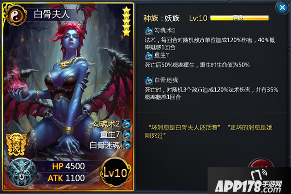 死而复生,伤害爆炸。简单的8个字可以完美体现白骨夫人的特点,白骨夫人还具有其他种族卡牌没有的特性,那就是魅惑。试想一下,在对方大举进攻之时,等到的不是敌方接二连三的轮番攻击,而是对方的卡牌一个接一个自相残杀,自己在一盘看好戏的感觉,重生与白骨迷魂的特性相结合,就很有可能好戏一场接一场,小编也只能笑而不语了!