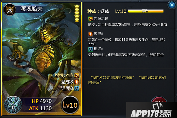 渡魂船夫,也是玩家自主选择可以刷出的第一个五星妖族卡牌(天外天四重天掉落碎片),绝技怨恨之镰加诅咒,拥有吸血效果和一定的站场能力,续航和减攻相结合,聚魂技能每死亡一个单位增加11%的攻击力及生命值,最高增加33%,变相的长大,是一张非常好用的卡牌。