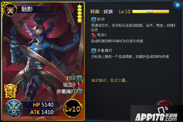 魅影,重做之后变得非常厉害的一张卡牌,吸血技能也就不说了吧,“封印”神技,普通攻击就可以领目标无法发动法术、技能、绝技1回合,对方也就只能眼睁睁的普通攻击了,可以令很多卡牌哑火的哦。而且“多重痛打”,要是搭配上令对方受到负面状态的卡牌,魅影的伤害又提升一个层次了,好卡不用说,谁用谁知道!