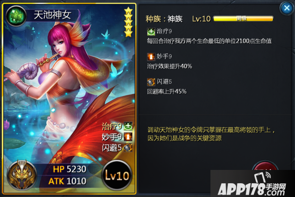 天池神女(天外天六重天可掉落碎片)的重要性已经不言而喻,仅有的四张五星回血卡牌,俗称“奶妈”那么奶妈在一场游戏中除了她回血的作用之外还有什么是我们所重视的呢?没错,生存能力,若奶妈在一场战斗中缺少生存能力的,不是一个好奶妈,天池神女除了出色的治疗量提升之外还自带回避率45%,是拥有很强的站桩能力,治疗与闪避的搭配是挺好用的~