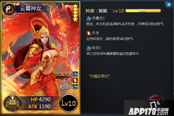 云霄神女是七天签到活动里送的一张五星卡牌,别以为是送的就忽视这张卡牌的实力,伏魔光这可是被誉为秒人神技,光是看伤害就已爆炸,再加上可吸收对方怒气,这就使得与拥有伏魔光的单位对位时,基本是无法释放绝技的,对于绝技流的卡牌,这点可以算是十分致命的,回合结束额外获得50怒气,可以使云霄神女在第二回合开始,每回合都能释放绝技,还有自带轮回神技,可谓要输出有输出要轮回有轮回哦~