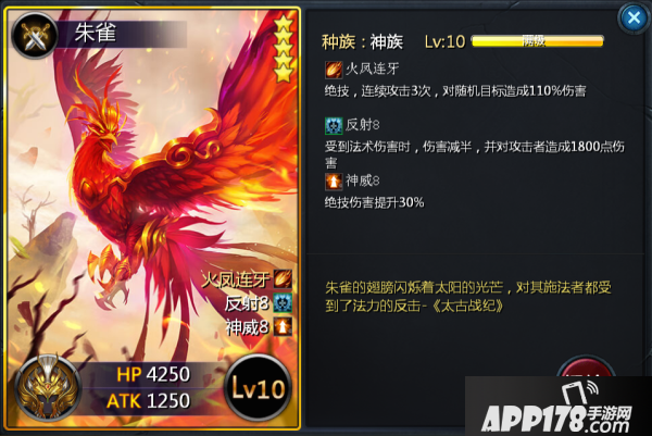 朱雀,四大神兽,拥有法系克星之称,强大的反射能力使朱雀在高爆发的法系单位毫不畏惧,同时也是法系脆皮的噩梦、天敌,还有朱雀的绝技伤害提升,配合着3连击,要是打在同一单位即使是肉盾也是吃不消的哦!