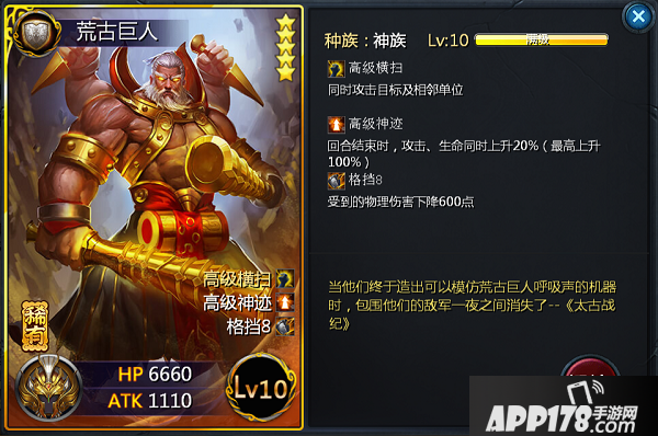在很久很久以前,曾经有一张卡牌,它屡遭削弱,却依然强势,那就是荒古巨人,一张在内测期间被玩家誉为“策划大大的亲生儿子”的卡牌23333。好了,不开玩笑了,说到荒古巨人,可以说是神族的代表人物,高级横扫,拥有小型的aoe,搭配着高级神迹,是一个强大的存在,这一只有神族才拥有的特性更大大增强了神族的作战能力,回合结束时,生命和攻击同时百分比提升,最高可提升100%。简单来讲就是,一个5000血,1500攻击的神族卡牌,如果有神迹特性,那么最高可以变为10000血和3000攻击,是不是很吓人,荒古巨人熬过三回合,基本算是成长起来了。