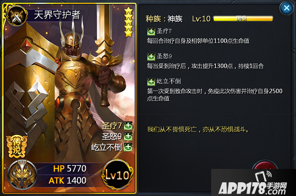 咱先看看技能,是不是觉得天界守护者是个奶妈?它的确是拥有奶妈的能力,但是也可以说是拥有秒杀的爆发,主要还是看自己利用,圣怒9:每当受到治疗后,攻击提升1300点,持续一回合,小道消息,受到队友和法宝治疗这些都会有加成,那攻击力翻几翻是没问题,实际效果还需大家试验试验,强劲的输出加上“屹立不倒”的存在,在受到致命攻击时,即使有不良状态,也会触发这个技能的。果然是“从不畏惧死亡,亦不恐惧战斗”