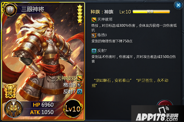 如果说荒古巨人是神族的代表人物,那么三眼神将则是神族的领军级别人物,给人以庄重威严,高高在上的感觉,绝技带来高额的伤害同时还带来一次全体抵抗,法系反射都提升了小额的输出,格挡技能的存在,也提供了强大站桩能力,无论从形象还是技能都是充满强大的神族气息!