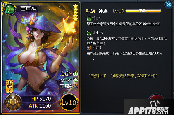 “治疗他们” “如果无法治疗,我就复活他们” 霸气侧漏的一句话,不仅能治疗,而且还能复活,这就是百草神!自带“不屈”的技能,即使百草神受到爆炸性的伤害也不会那么容易死亡,稳定的治疗以及复活能力,相信百草神只要能用上一次绝技,她的价值已经体现出来了,试问这种卡牌谁不爱呢?