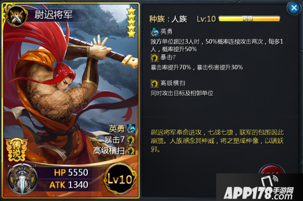 尉迟将军光从名字上来看就给人一种所向披靡以一敌十的威武。“英勇”在敌方单位4人时,有50%几率可以攻击两次,而如果敌方有5人时,便可以100%触发两次攻击。“高级横扫”可以保证尉迟的每次攻击都是小范围aoe,而“暴击”更是赋予了其更加高额的伤害。其实单从卡牌来说,尉迟将军并没有想象中的那么暴力,然而如果你的卡组是以人族为主,并配有人族种族法宝“干将莫邪”的情况下,那么尉迟将军可以向你完美诠释什么叫做恐惧。假定敌方还有5人在场,而此时你的尉迟将军将要行动,配以“干将莫邪”的会心效果,嘿嘿嘿,等尉迟将军行动结束后,你就明白花儿为什么这样红了。